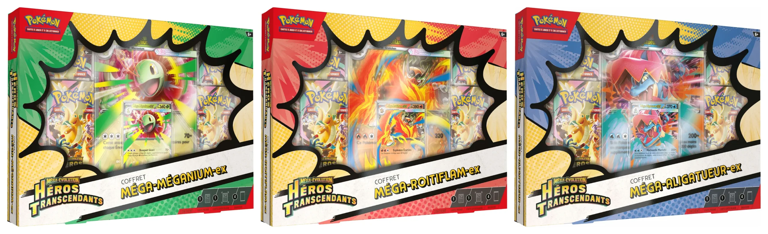 Quel partenaire Pokémon choisirez-vous ? Grâce à l’éclosion de nouveaux pouvoirs, Méga-Méganium-ex offre aux Pokémon de votre adversaire un Bouquet Géant rempli d’importants dégâts ! Encerclé par les flammes, Méga-Roitiflam-ex libère une Explosion Écarlate pour terrasser son adversaire ! Avec ses crocs et ses griffes acérées, Méga-Aligatueur-ex ne fait qu’une bouchée du Pokémon affaibli de votre adversaire avec Mâchouille Mortelle.