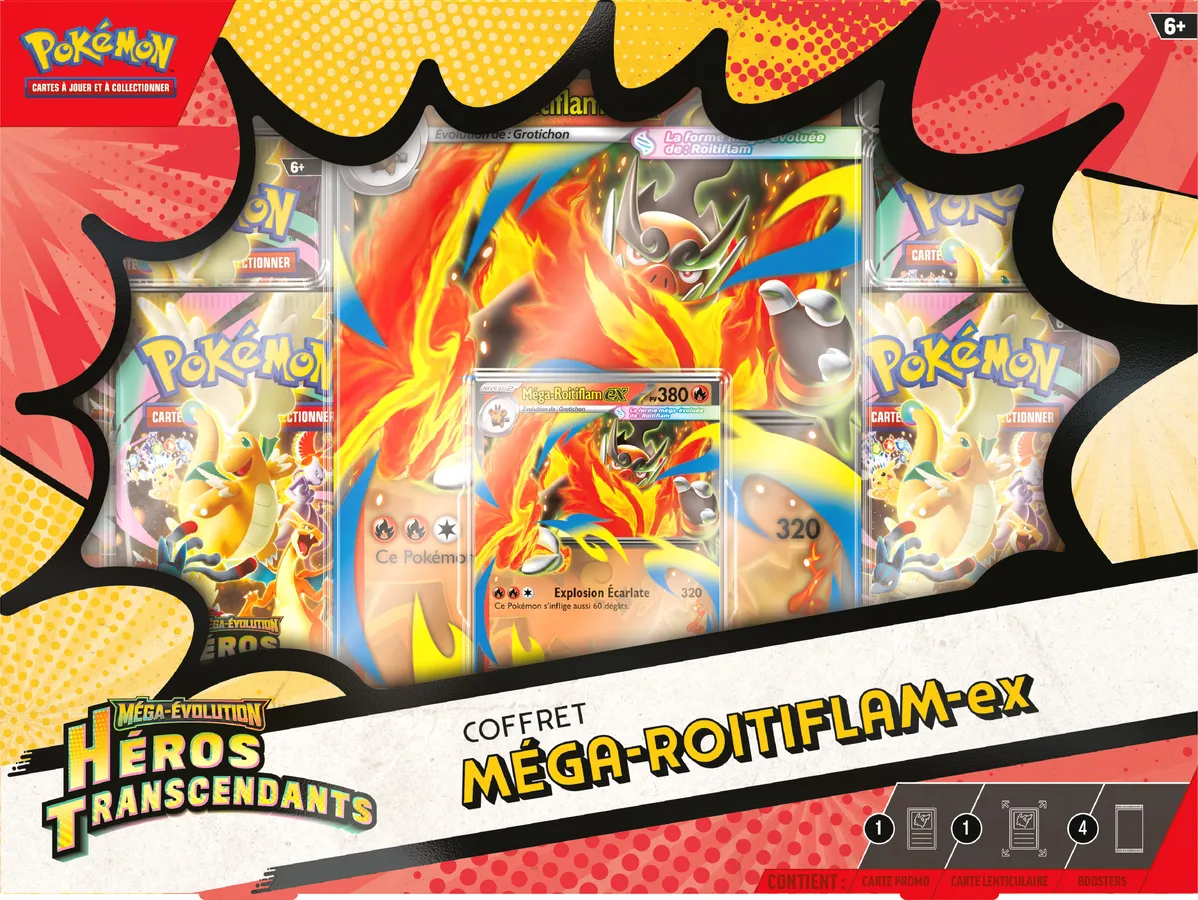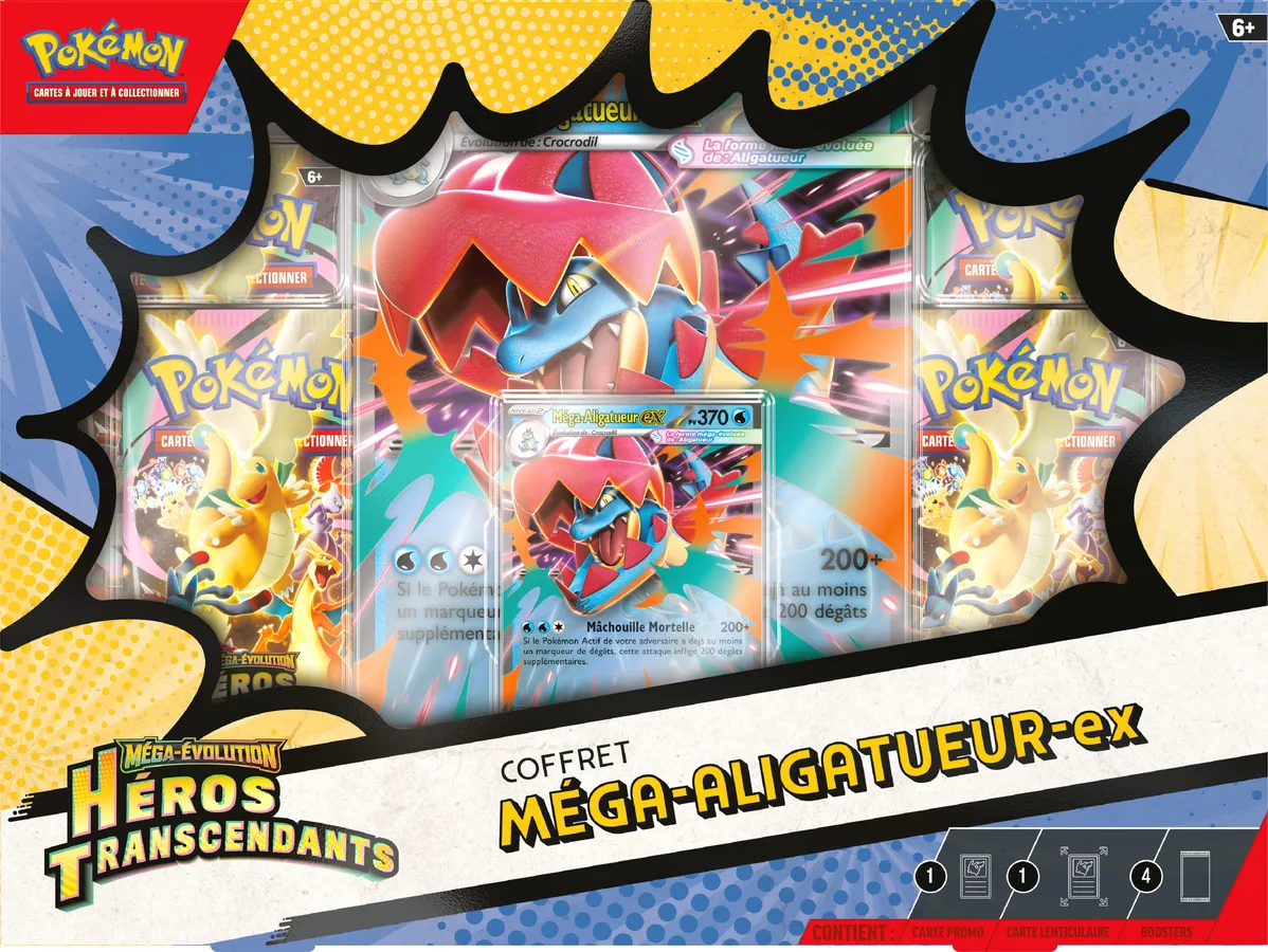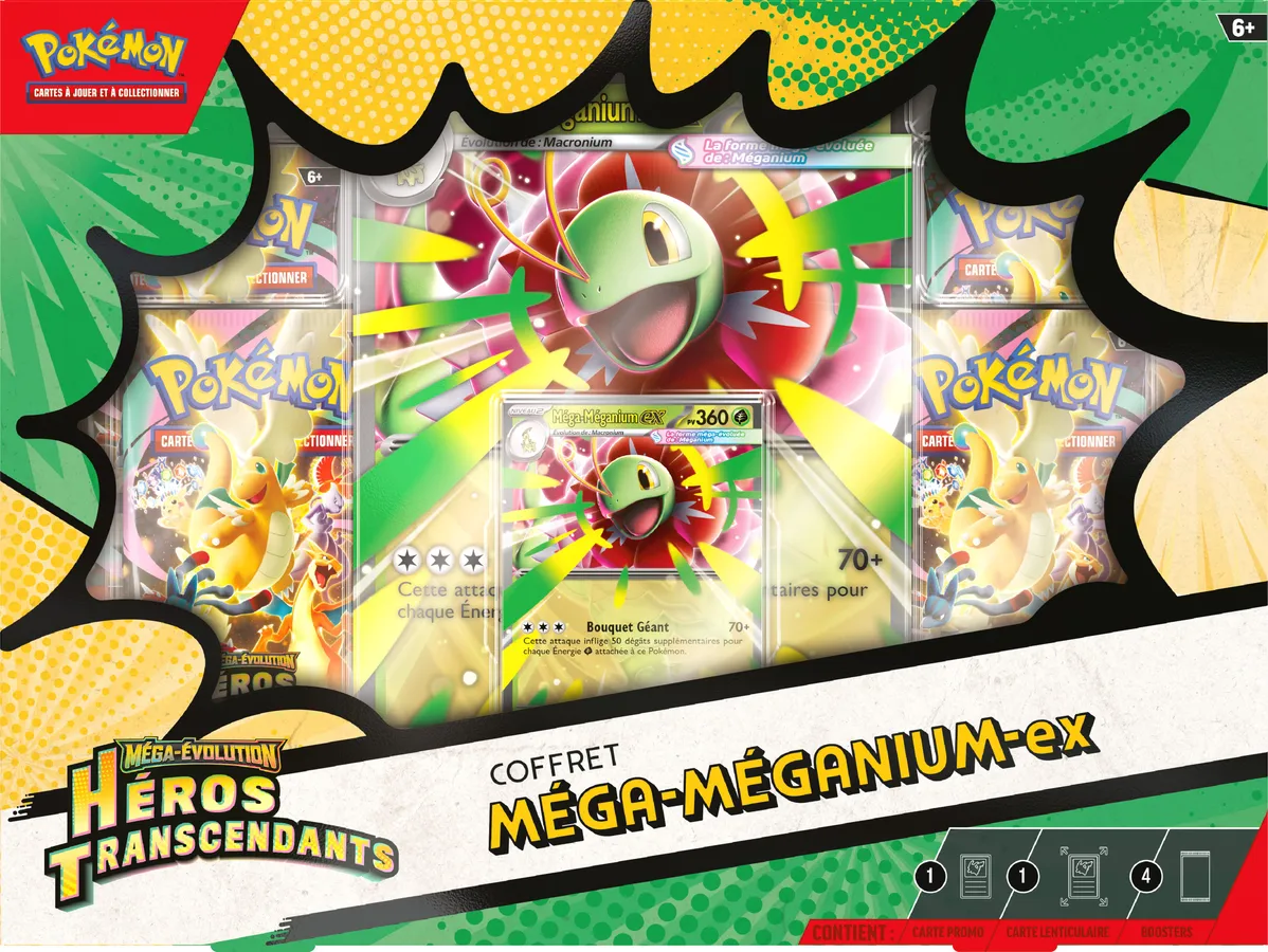 Forgez un lien qui développe la force de votre partenaire Pokémon au-delà de ses limites avec la Méga-Évolution ! Dans ces coffrets, vous trouverez une carte promo brillante pour le jeu, ainsi qu’une carte grand format lenticulaire avec une illustration dynamique et quatre boosters de l’extension spéciale Méga-Évolution – Héros Transcendants.